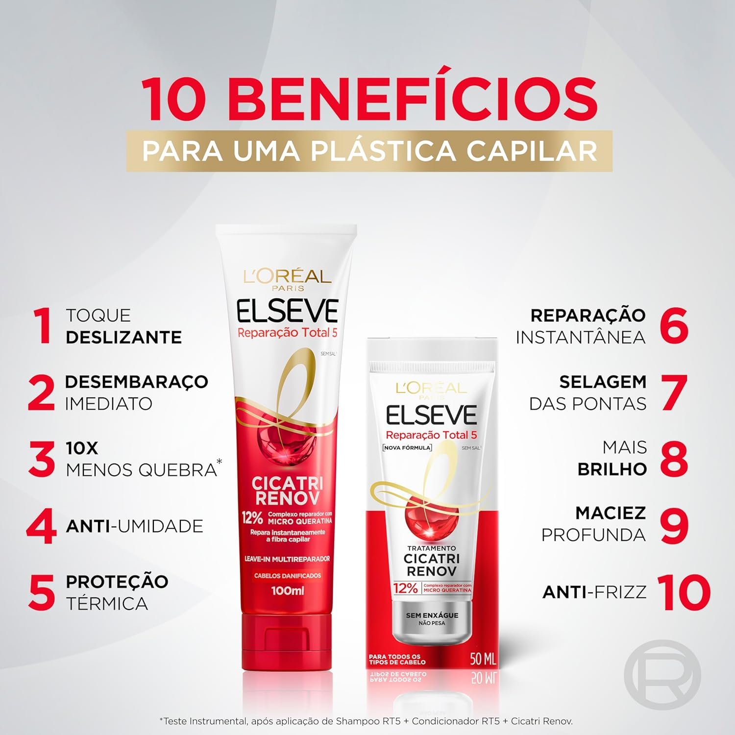 O Leave-In Cicatri Renov Elseve Reparação Total 5 identifica e repara os danos fio a fio do cabelo sem pesar. Ele trata os fios instantaneamente sem pesar. Possui 10 benefícios para uma plástica capilar: reparação instantânea; selagem das pontas; 100% mais brilho; maciez profunda; toque deslizante; desembaraço imediato; 10x menos quebra; anti-frizz; anti-umidade e proteção térmica. Para todos os tipos de cabelo, renova e protege a qualquer hora e em qualquer lugar. Pode ser usado com o cabelo seco ou molhado, antes ou depois do secador.